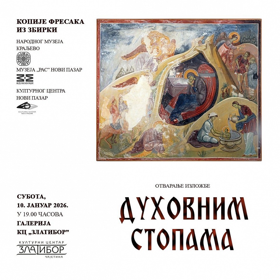 Година у Културном центру, сада већ традиционално, почиње манифестацијом „Духовним стопама”, која траје између два велика празника - Божића и Сретења. Отворићемо је истоименом изложбом, у суботу, 10. јануара, у 19 часова, а чине је копије фресака из краљевачког Музеја, као и Музеја „Рас” и Културног центра из Новог Пазара. На отварању ће наступити хор „Хармонија.”
