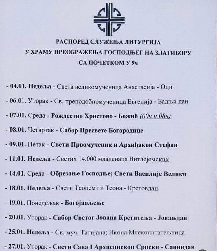 Распоред служења светих Литургија у цркви Преображења Господњег на Златибору- јануар 2025: