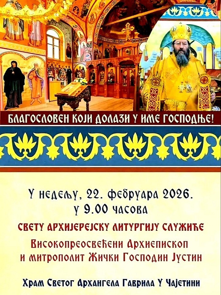 На покладе у Недељу 22.фебруара 2026. године дочек Високопреосвећеног митрополита жичког г-дина Јустина у 08:30ч, света архијерејска Литургија у 09.00 часова